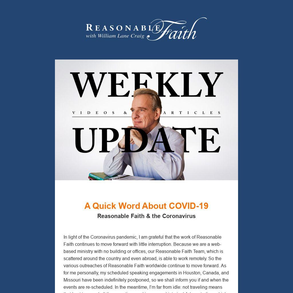 In light of the Coronavirus pandemic, I am grateful that the work of Reasonable Faith continues to move forward with little interruption. Because we are a web-based ministry with no building or offices, our Reasonable Faith Team, which is scattered around the country and even abroad, is able to work remotely. So the various outreaches of Reasonable Faith worldwide continue to move forward. As for me personally, my scheduled speaking engagements in Houston, Canada, and Missouri have been indefinitely postponed, so we shall inform you if and when the events are re-scheduled. In the meantime, I’m far from idle: not traveling means that I get to spend all the more time working on my historical Adam studies, which I’m only too glad to do. I was into social isolating before social isolating was cool!