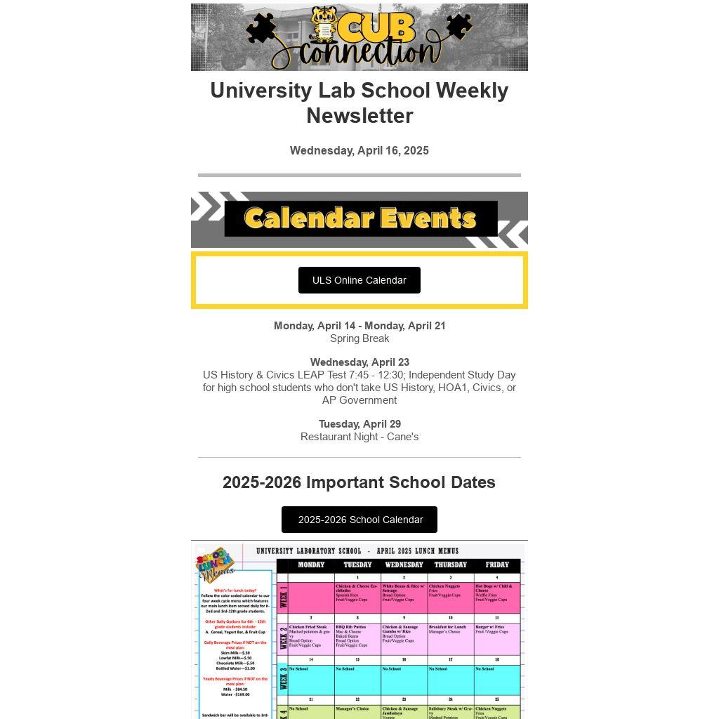 • Wednesday, April 23rd – 12:30 p.m. dismissal U.S. History & Civics LEAP