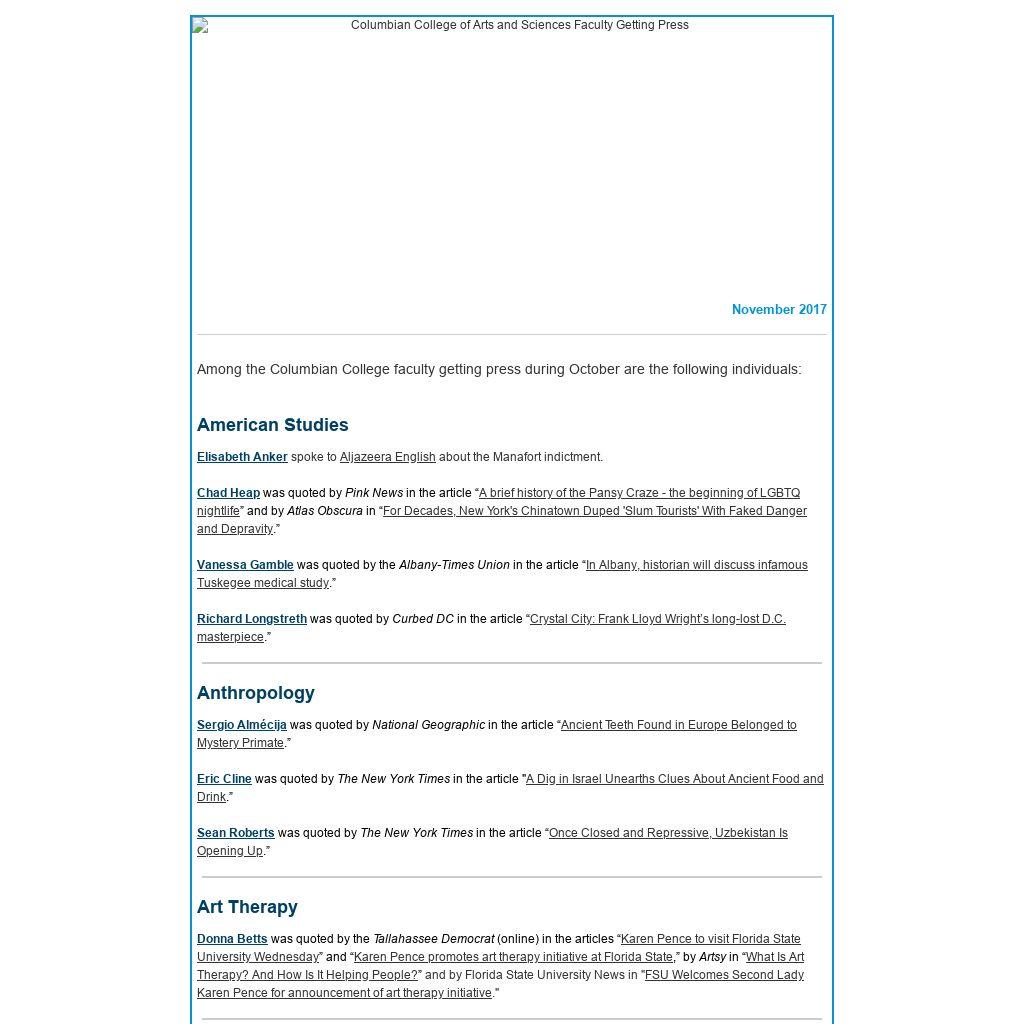 Among the Columbian College faculty getting press during October are the following individuals: