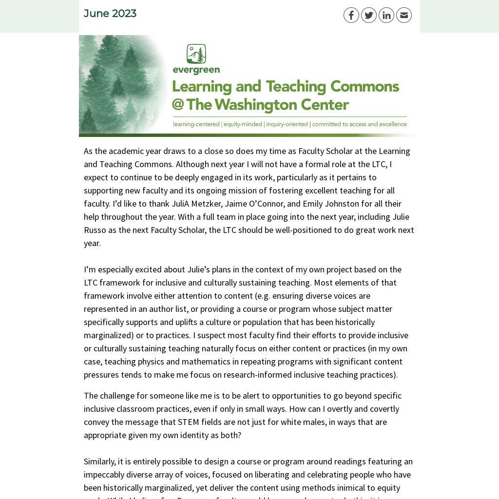 I’m especially excited about Julie’s plans in the context of my own project based on the LTC framework for inclusive and culturally sustaining teaching. Most elements of that framework involve either attention to content (e.g. ensuring diverse voices are represented in an author list, or providing a course or program whose subject matter specifically supports and uplifts a culture or population that has been historically marginalized) or to practices. I suspect most faculty find their efforts to provide inclusive or culturally sustaining teaching naturally focus on either content or practices (in my own case, teaching physics and mathematics in repeating programs with significant content pressures tends to make me focus on research-informed inclusive teaching practices).