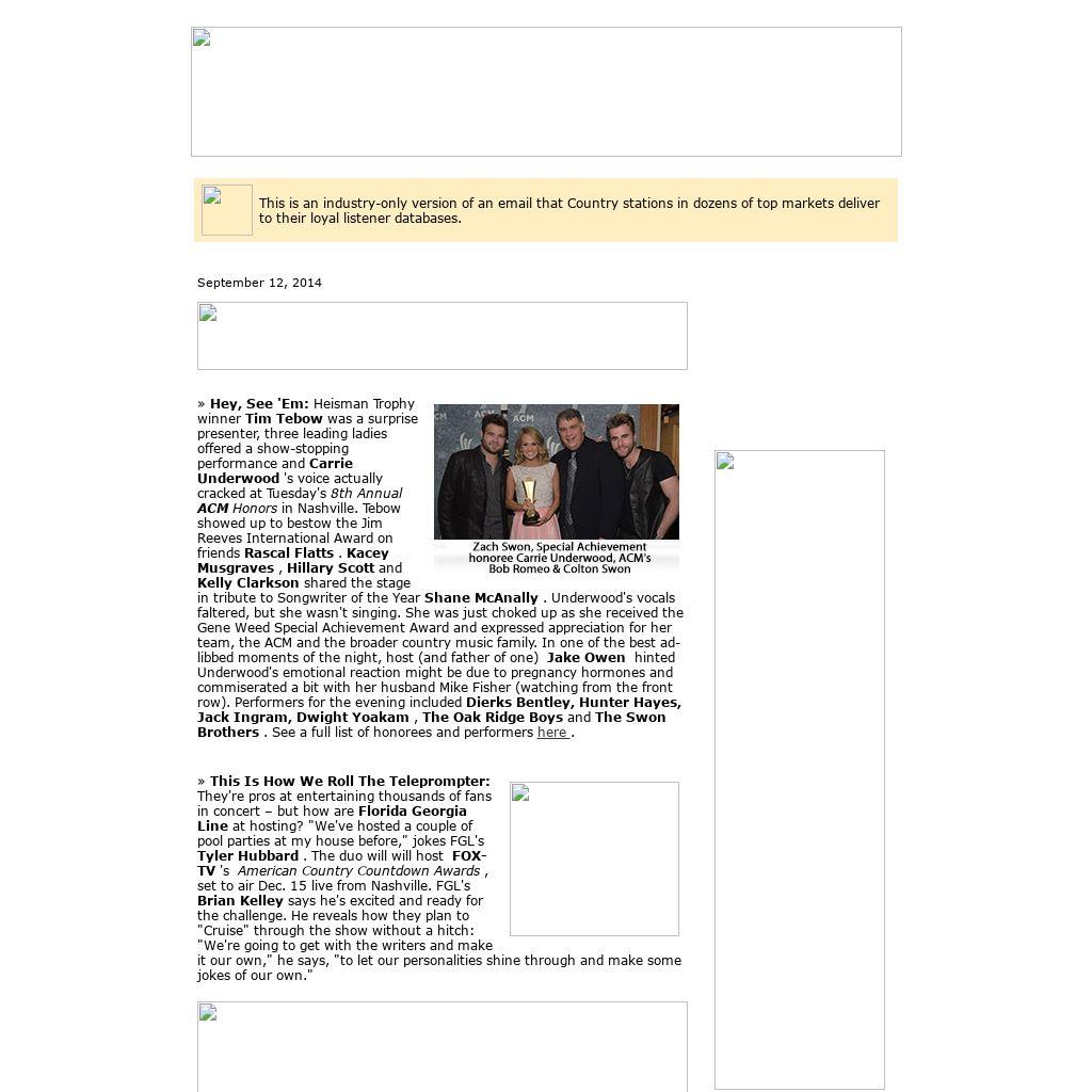 The CMA Songwriters Series will take writers Jamey Johnson , Raul Malo , Bob DiPiero and Rob Hatch to Austin, TX Oct. 15 to share the stories behind their songs. Tickets are on sale Sept. 12. More info here . Birthdays Friday (9/12): Jennifer Nettles (Sugarland), the late George Jones, the late Helen Carter. Saturday (9/13): Joe Don Rooney (Rascal Flatts), Bobbie Cryner, Aaron Benward (Blue County), the late Bill Monroe. Sunday (9/14): John Berry, Beth Nielsen Chapman, Danielle Peck, Blake Wise, Kimberly Williams-Paisley, the late Mae Boren Axton, the late Don Walser. Monday (9/15): Andy Gibson, Alexander Arzamastsev (Bering Strait), the late Roy Acuff. On TV Friday (9/12): Connie Britton, Live With Kelly & Michael (syndicated); Maddie & Tae, Late Show With David Letterman (CBS); Hunter Hayes, Jimmy Kimmel Live (ABC repeat). Upcoming Album Releases Sept. 16 Tim McGraw Sundown Heaven Town George Strait The Cowboy Rides Away: Live From AT&T Stadium Sept. 23 Kenny Chesney The Big Revival Lee Ann Womack The Way I'm Livin' Big & Rich Gravity Sept. 30 Lady Antebellum 747 Blake Shelton Bringing Back The Sunshine Marty Stuart Saturday Night & Sunday Morning Ricky Skaggs and Sharon White Hearts Like Ours Oct. 7 Jason Aldean Old Boots, New Dirt Old Dominion Self-Titled Various Artists The Best Of Me Soundtrack Oct. 14 Florida Georgia Line Anything Goes Oct. 21 Little Big Town Pain Killer Oct. 28 Stoney Larue Aviator Gretchen Wilson STILL Here For The Party nbsp; Nov. 4 Ronnie Milsap , The RCA Albums Collection The Doobie Brothers Southbound |
