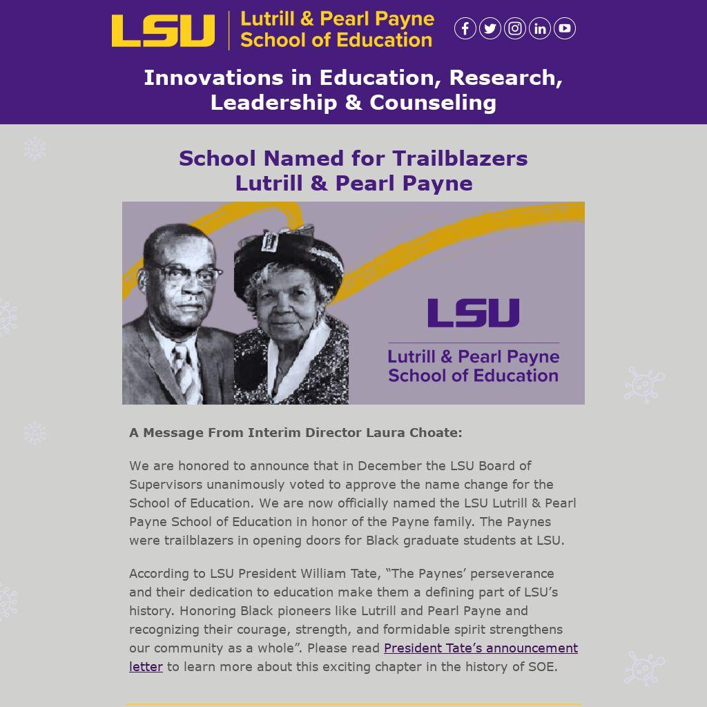 We are honored to announce that in December the LSU Board of Supervisors unanimously voted to approve the name change for the School of Education. We are now officially named the LSU Lutrill & Pearl Payne School of Education in honor of the Payne family. The Paynes were trailblazers in opening doors for Black graduate students at LSU.