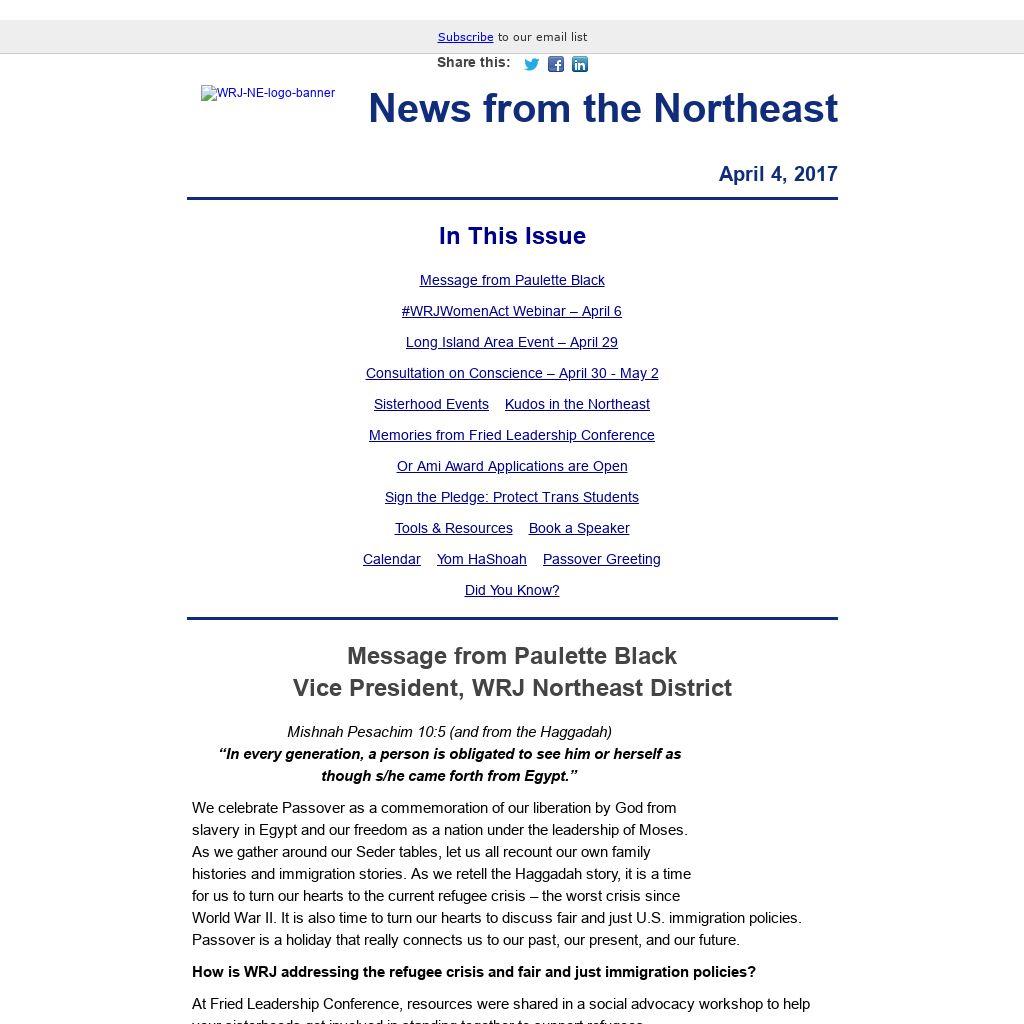 | Passover begins at sundown on Monday, April 10 For recipes, activities and more information, CLICK HERE Chag sameach from the Board of the Northeast District of Women of Reform Judaism!