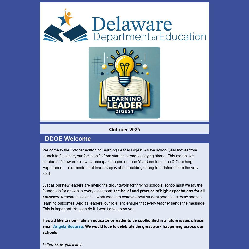 Welcome to the October edition of Learning Leader Digest. As the school year moves from launch to full stride, our focus shifts from starting strong to staying strong. This month, we celebrate Delaware’s newest principals beginning their Year One Induction & Coaching Experience — a reminder that leadership is about building strong foundations from the very start.