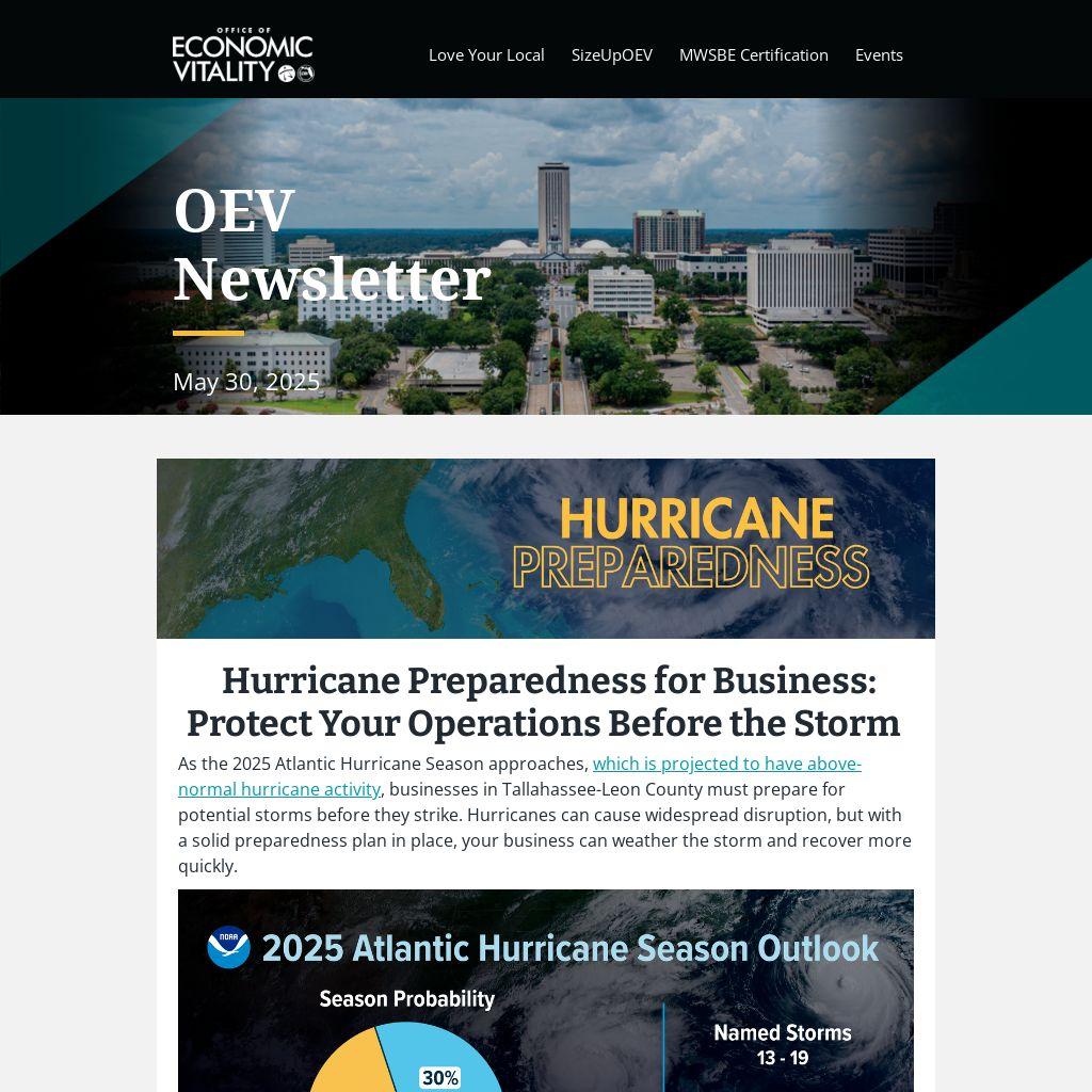 As the 2025 Atlantic Hurricane Season approaches, which is projected to have above-normal hurricane activity, businesses in Tallahassee-Leon County must prepare for potential storms before they strike. Hurricanes can cause widespread disruption, but with a solid preparedness plan in place, your business can weather the storm and recover more quickly.