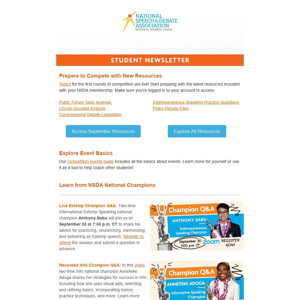 Topics for the first rounds of competition are live! Start prepping with the latest resources included with your NSDA membership. Make sure you're logged in to your account to access.