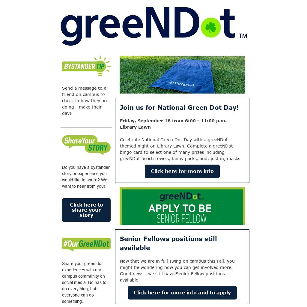 Celebrate National Green Dot Day with a greeNDot themed night on Library Lawn. Complete a greeNDot bingo card to select one of many prizes including greeNDot beach towels, fanny packs, and, just in, masks!