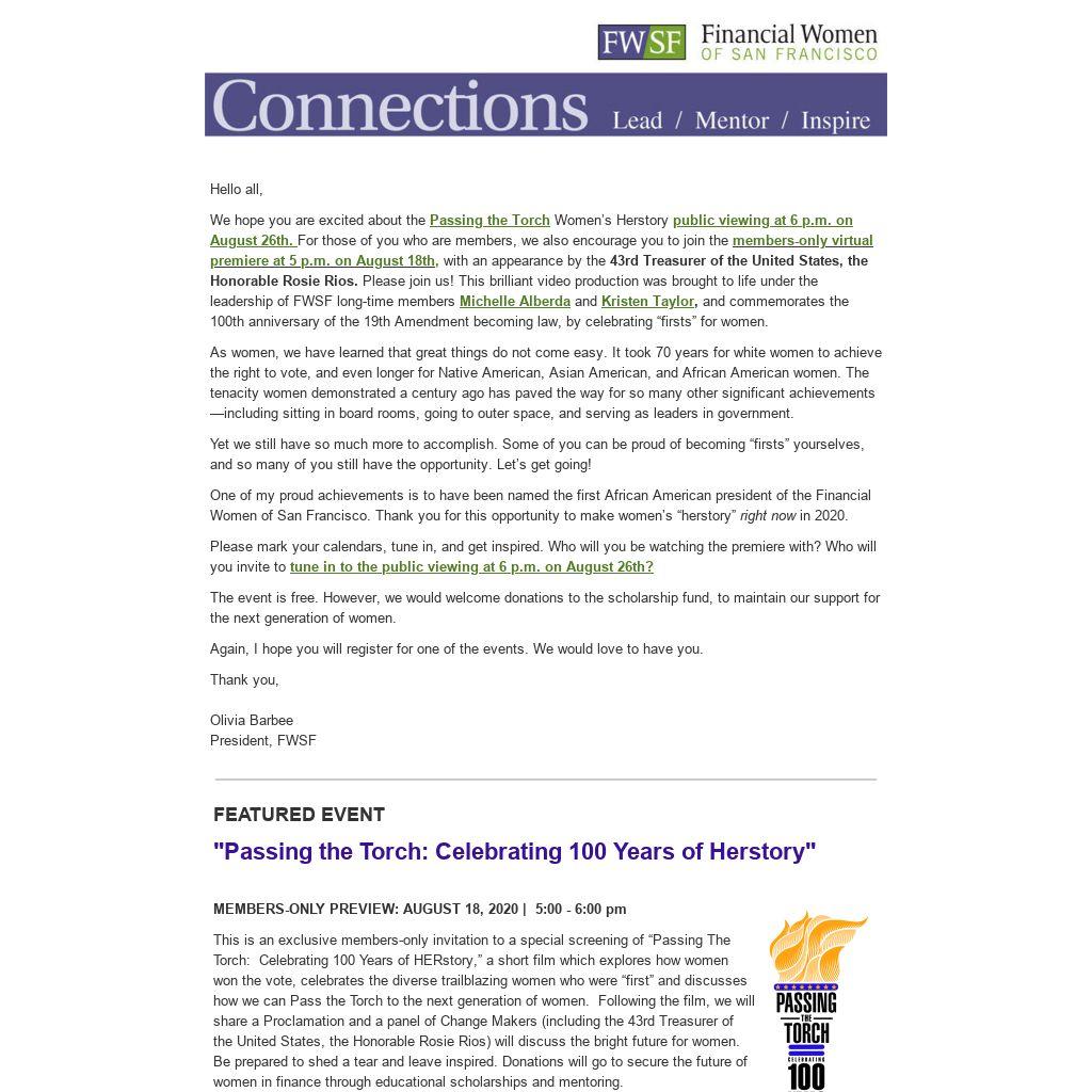 Let’s celebrate the Centennial of the 19th Amendment! Join the Financial Women of San Francisco for the premier of the short film “Passing the Torch: Celebrating 100 Years of HERstory,” which explores how women won the vote, celebrates the diverse trailblazing women who were “first” and discusses how we can Pass the Torch to the next generation of women. Following the film, we will share a Proclamation and a panel of Change Makers will discuss the bright future of women. Be prepared to shed a tear and leave inspired. This free one-hour event is perfect for girlfriends/families/group virtual watch parties. Please share! Donations will go to secure the future of women through educational scholarships and mentoring.