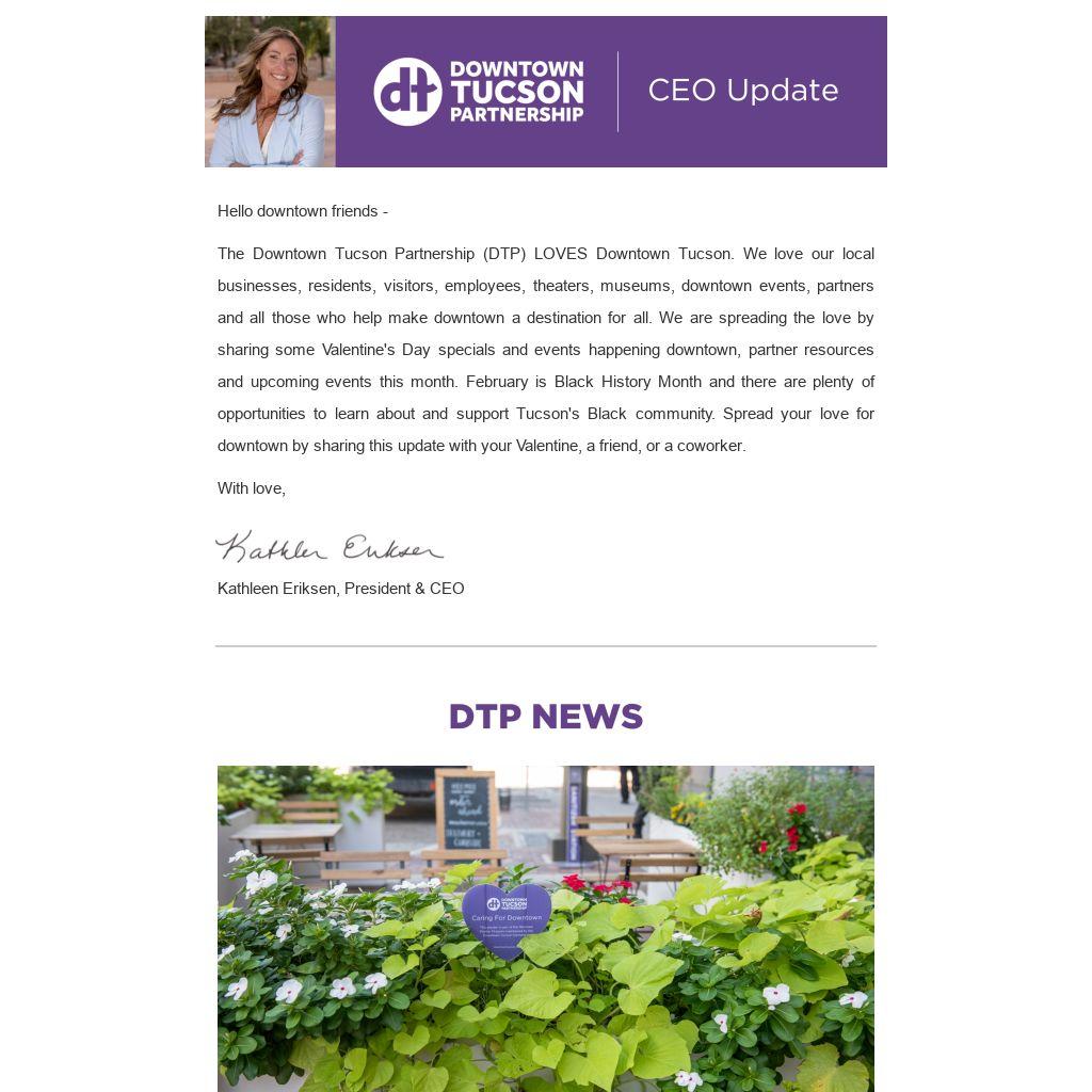 The Downtown Tucson Partnership (DTP) LOVES Downtown Tucson. We love our local businesses, residents, visitors, employees, theaters, museums, downtown events, partners and all those who help make downtown a destination for all. We are spreading the love by sharing some Valentine's Day specials and events happening downtown, partner resources and upcoming events this month. February is Black History Month and there are plenty of opportunities to learn about and support Tucson's Black community. Spread your love for downtown by sharing this update with your Valentine, a friend, or a coworker.