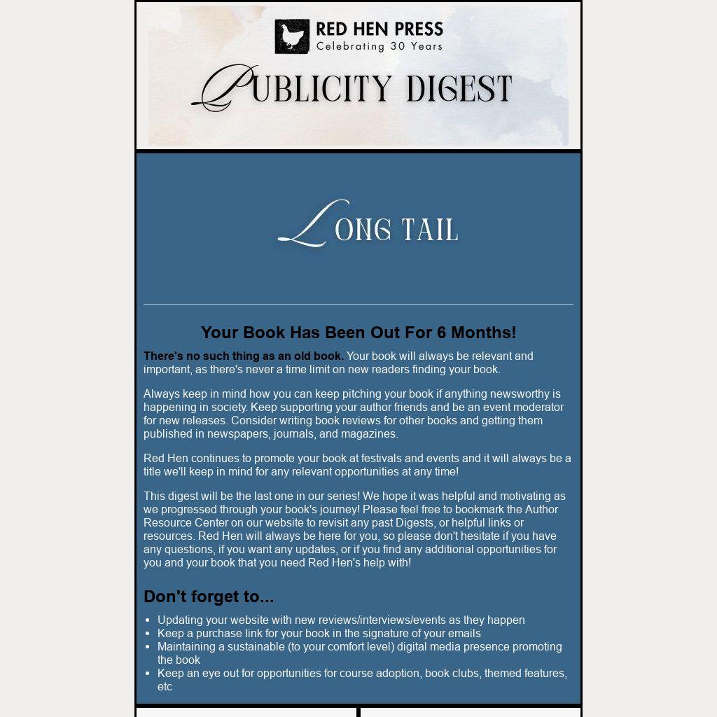 This digest will be the last one in our series! We hope it was helpful and motivating as we progressed through your book's journey! Please feel free to bookmark the Author Resource Center on our website to revisit any past Digests, or helpful links or resources. Red Hen will always be here for you, so please don't hesitate if you have any questions, if you want any updates, or if you find any additional opportunities for you and your book that you need Red Hen's help with!