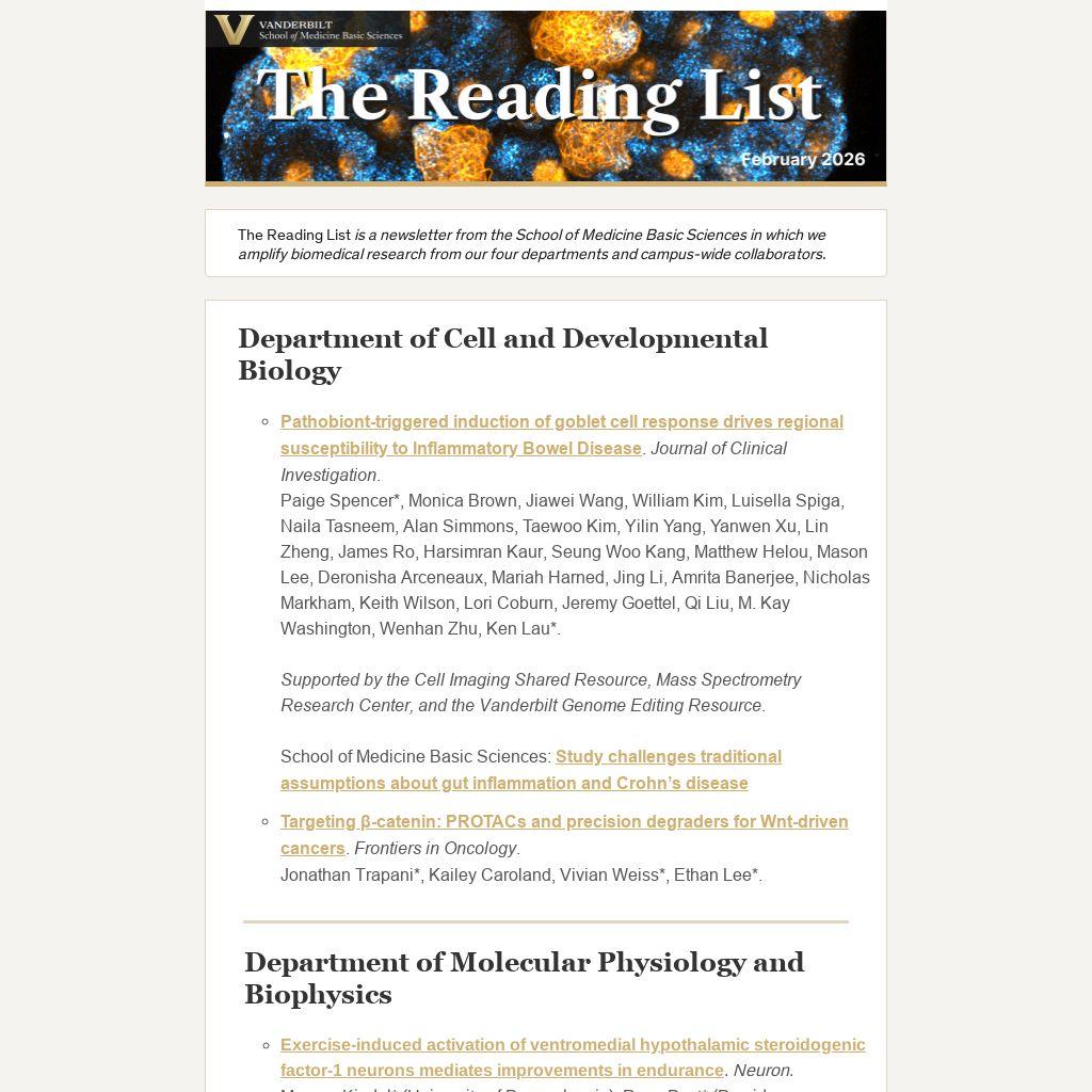 The Reading List is a newsletter from the School of Medicine Basic Sciences in which we amplify biomedical research from our four departments and campus-wide collaborators.
