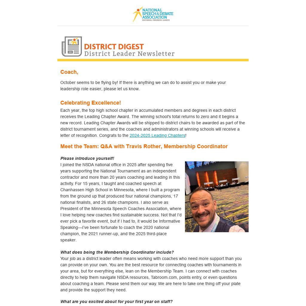 Your job as a district leader often means working with coaches who need more support than you can provide on your own. You are the best resource for connecting coaches with tournaments in your area, but for everything else, lean on the Membership Team. I can connect with coaches directly to help them navigate NSDA resources, Tabroom.com, points entry, or even questions about coaching a team. Please send them our way. We are here to take one thing off your plate and provide the support they need.
