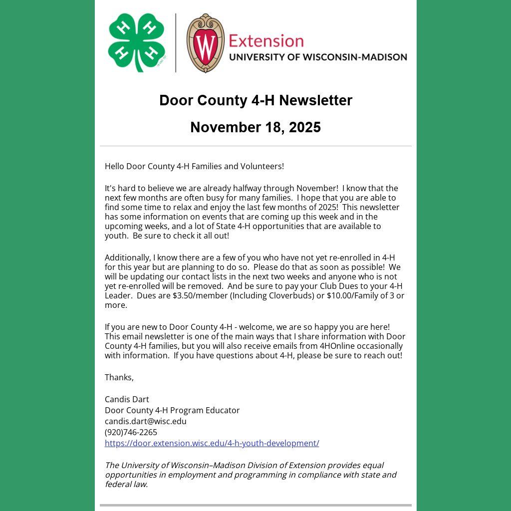 If you are new to Door County 4-H - welcome, we are so happy you are here! This email newsletter is one of the main ways that I share information with Door County 4-H families, but you will also receive emails from 4HOnline occasionally with information. If you have questions about 4-H, please be sure to reach out!