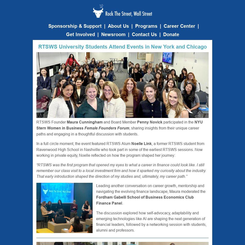 In a full circle moment, the event featured RTSWS Alum Noelle Link, a former RTSWS student from Ravenwood High School in Nashville who took part in some of the earliest RTSWS sessions. Now working in private equity, Noelle reflected on how the program shaped her journey: