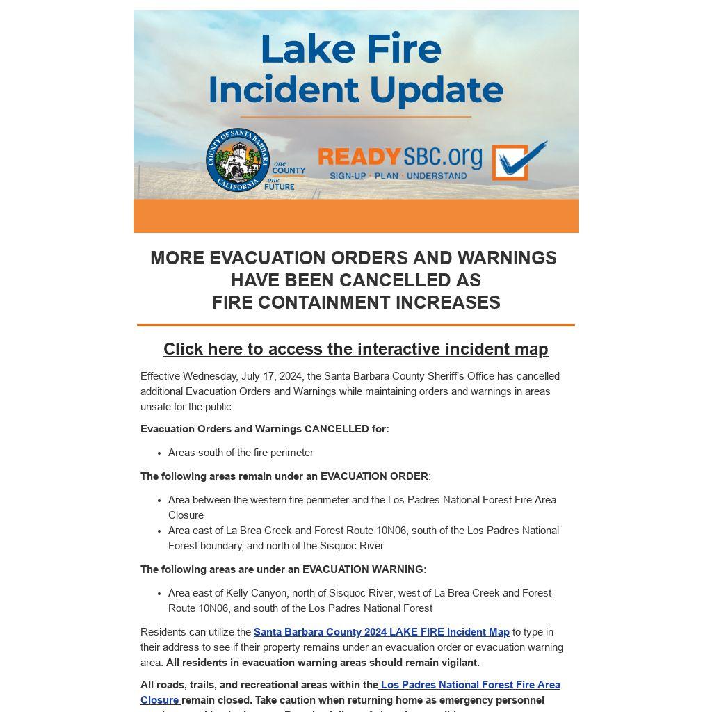 Residents can utilize the Santa Barbara County 2024 LAKE FIRE Incident Map to type in their address to see if their property remains under an evacuation order or evacuation warning area. All residents in evacuation warning areas should remain vigilant.