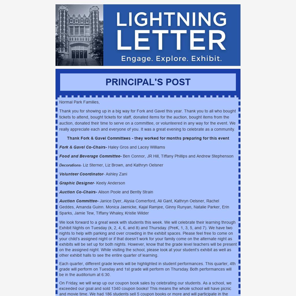 We look forward to a great week with students this week. We will celebrate their learning through Exhibit Nights on Tuesday (k, 2, 4, 6, and 8) and Thursday. (PreK, 1, 3, 5, and 7). We have two nights to help with parking and over crowding in the exhibit spaces. Please feel free to come on your child’s assigned night or if that doesn’t work for your family come on the alternate night as exhibits will be set up for both nights. However, know that the grade level teachers will be present on the assigned night. While visiting the school, please look at your student’s exhibit as well as other exhibit halls to see the entire quarter of learning.