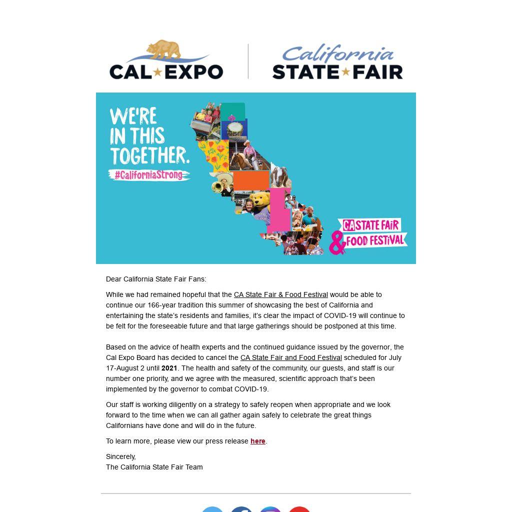 While we had remained hopeful that the CA State Fair & Food Festival would be able to continue our 166-year tradition this summer of showcasing the best of California and entertaining the state’s residents and families, it’s clear the impact of COVID-19 will continue to be felt for the foreseeable future and that large gatherings should be postponed at this time.