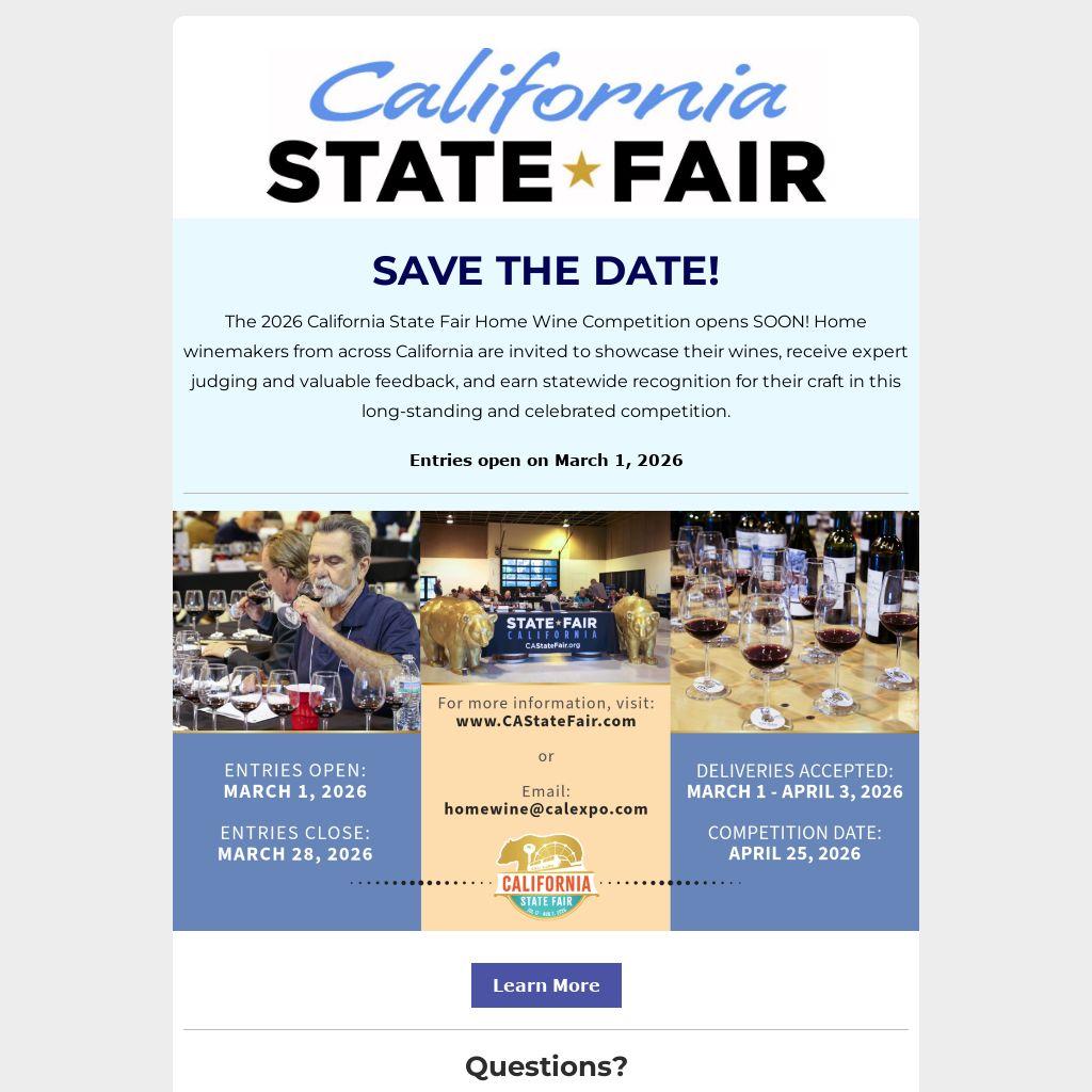The 2026 California State Fair Home Wine Competition opens SOON! Home winemakers from across California are invited to showcase their wines, receive expert judging and valuable feedback, and earn statewide recognition for their craft in this long-standing and celebrated competition.