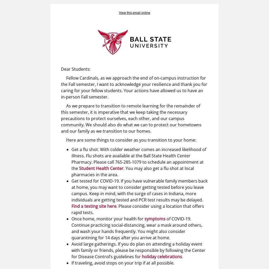 Fellow Cardinals, as we approach the end of on-campus instruction for the Fall semester, I want to acknowledge your resilience and thank you for caring for your fellow students. Your actions have allowed us to have an in-person Fall semester.