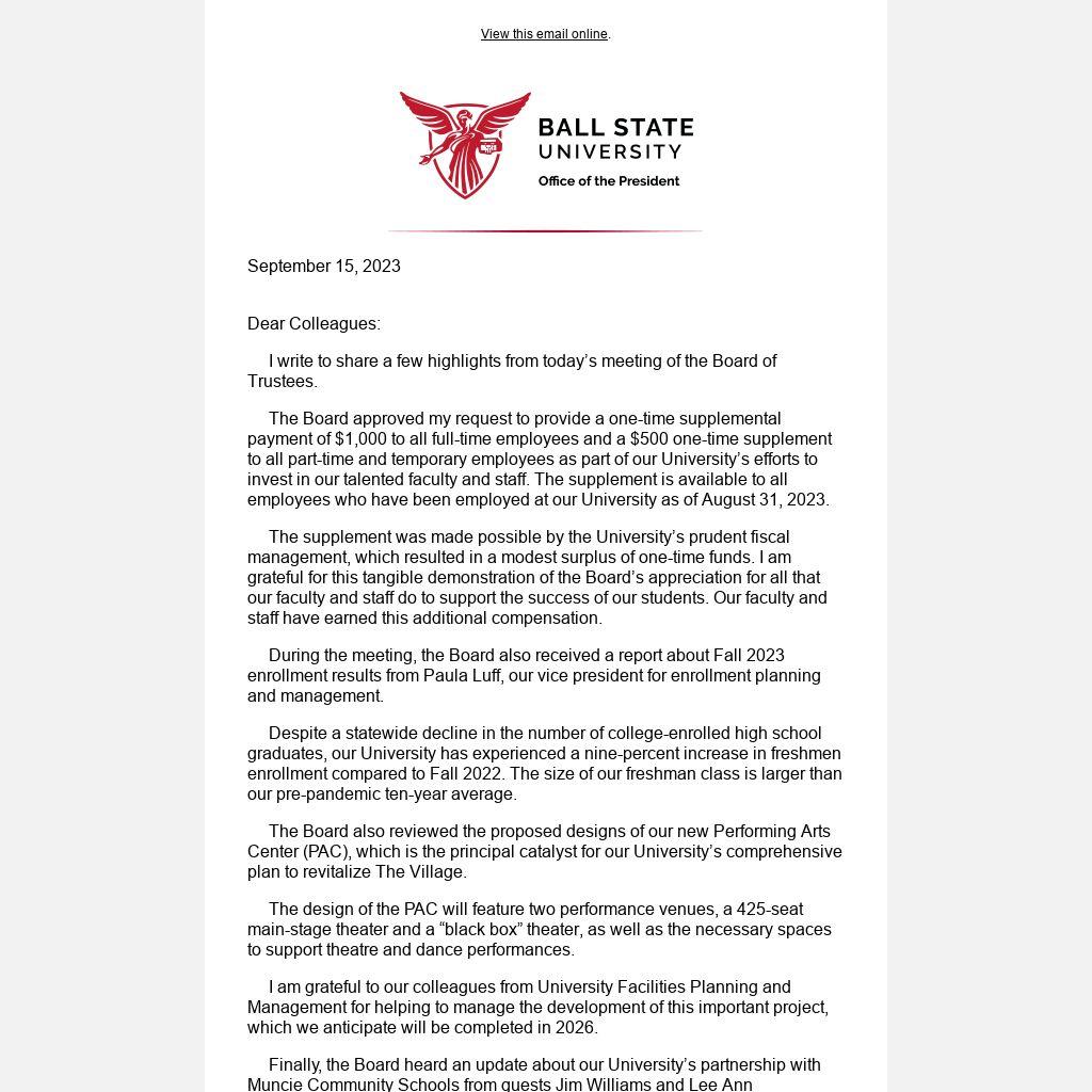 The Board approved my request to provide a one-time supplemental payment of $1,000 to all full-time employees and a $500 one-time supplement to all part-time and temporary employees as part of our University’s efforts to invest in our talented faculty and staff. The supplement is available to all employees who have been employed at our University as of August 31, 2023.