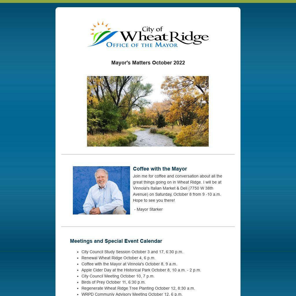 Coffee with the MayorJoin me for coffee and conversation about all the great things going on in Wheat Ridge. I will be at Vinnola's Italian Market & Deli (7750 W 38th Avenue) on Saturday, October 8 from 9 -10 a.m. Hope to see you there!