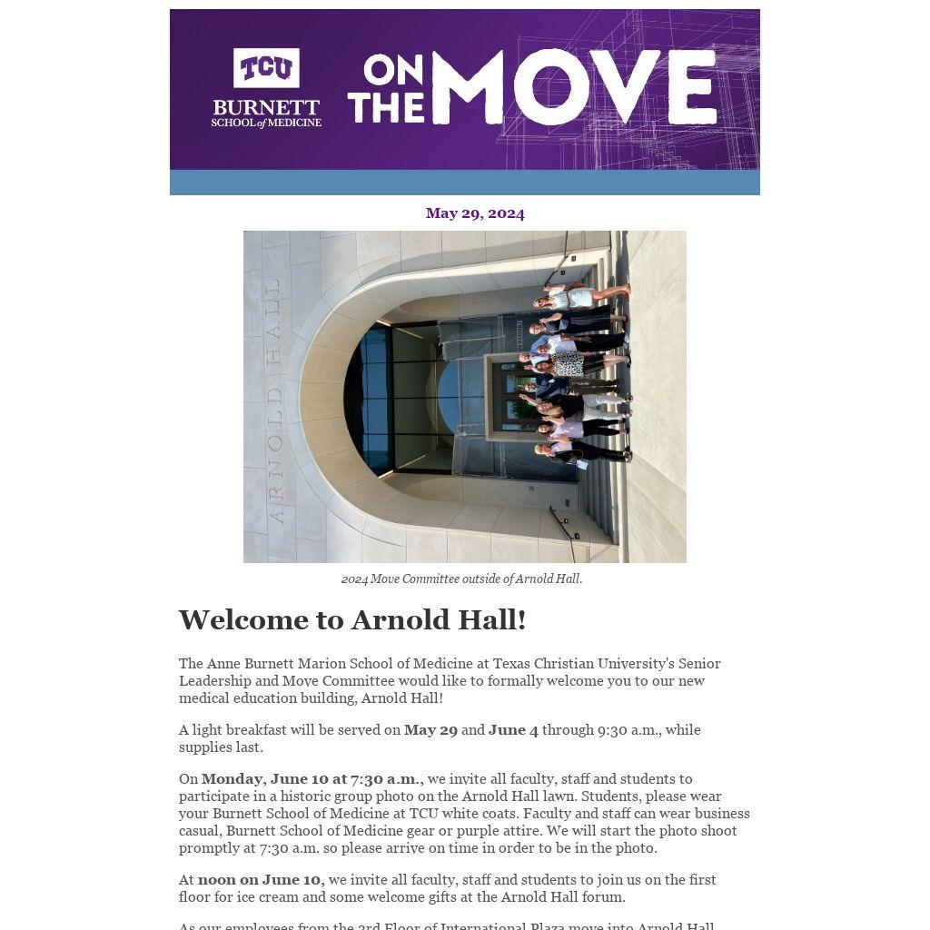 The Anne Burnett Marion School of Medicine at Texas Christian University's Senior Leadership and Move Committee would like to formally welcome you to our new medical education building, Arnold Hall!