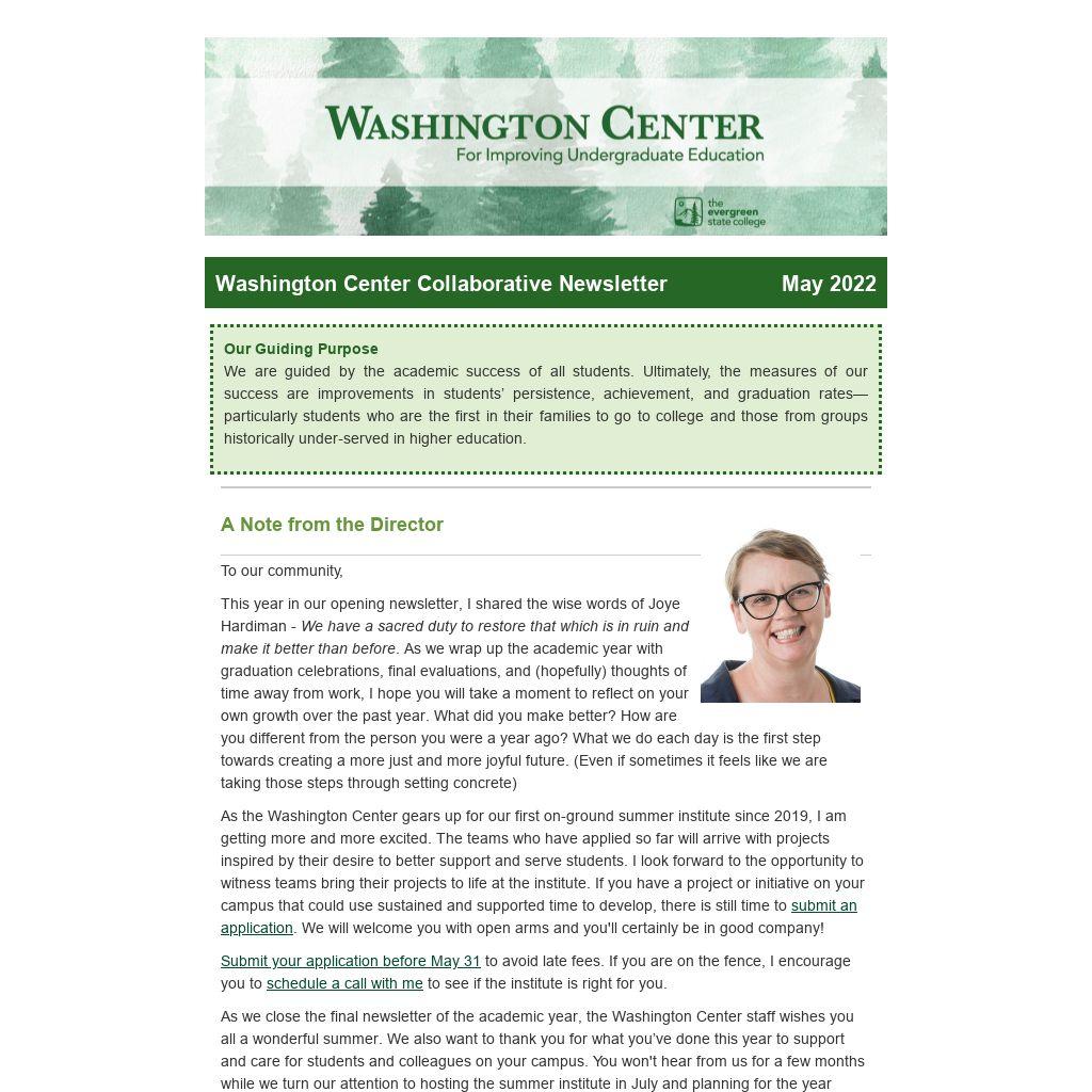 As we close the final newsletter of the academic year, the Washington Center staff wishes you all a wonderful summer. We also want to thank you for what you’ve done this year to support and care for students and colleagues on your campus. You won't hear from us for a few months while we turn our attention to hosting the summer institute in July and planning for the year ahead. We look forward to connecting with our community again in Fall!