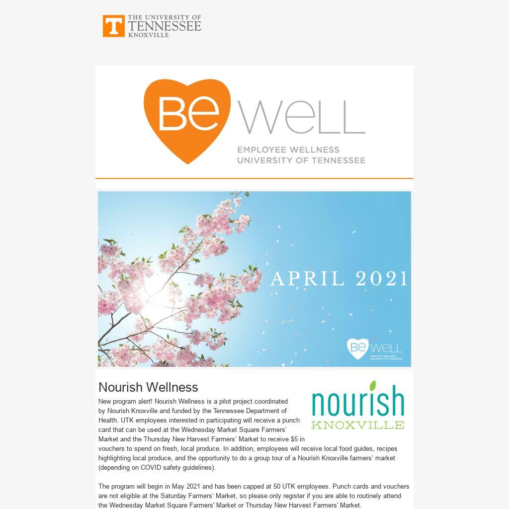 New program alert! Nourish Wellness is a pilot project coordinated by Nourish Knoxville and funded by the Tennessee Department of Health. UTK employees interested in participating will receive a punch card that can be used at the Wednesday Market Square Farmers’ Market and the Thursday New Harvest Farmers’ Market to receive $5 in vouchers to spend on fresh, local produce. In addition, employees will receive local food guides, recipes highlighting local produce, and the opportunity to do a group tour of a Nourish Knoxville farmers’ market (depending on COVID safety guidelines).