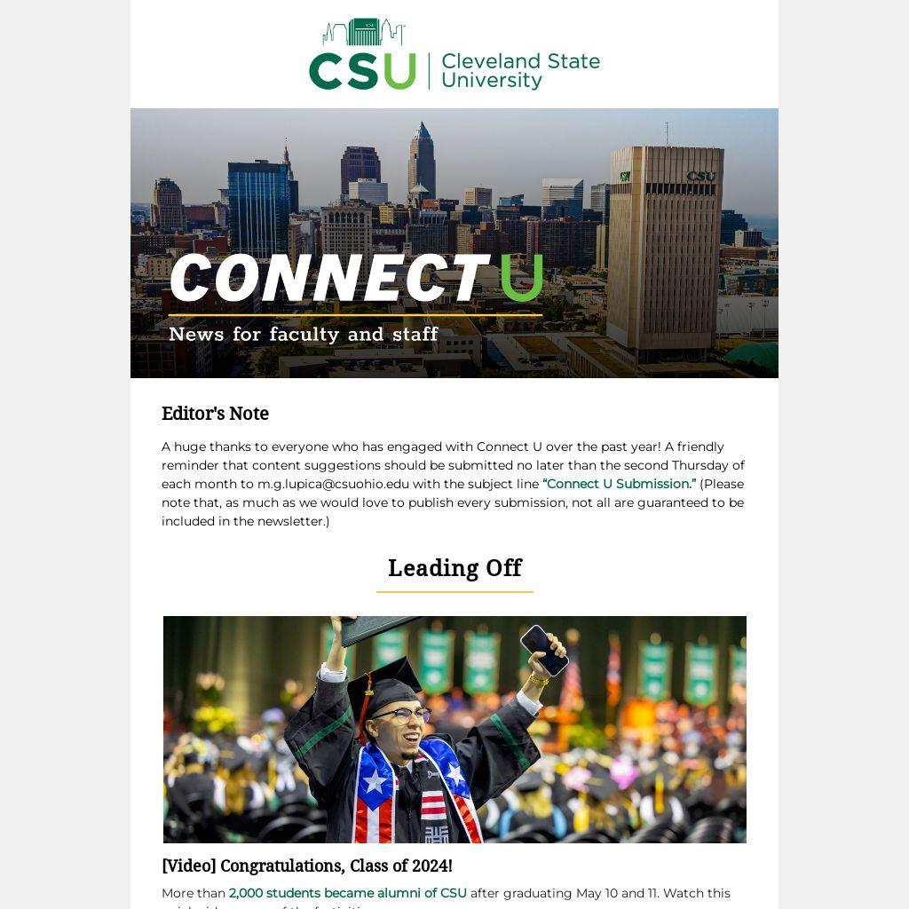 A huge thanks to everyone who has engaged with Connect U over the past year! A friendly reminder that content suggestions should be submitted no later than the second Thursday of each month to m.g.lupica@csuohio.edu with the subject line “Connect U Submission.” (Please note that, as much as we would love to publish every submission, not all are guaranteed to be included in the newsletter.)