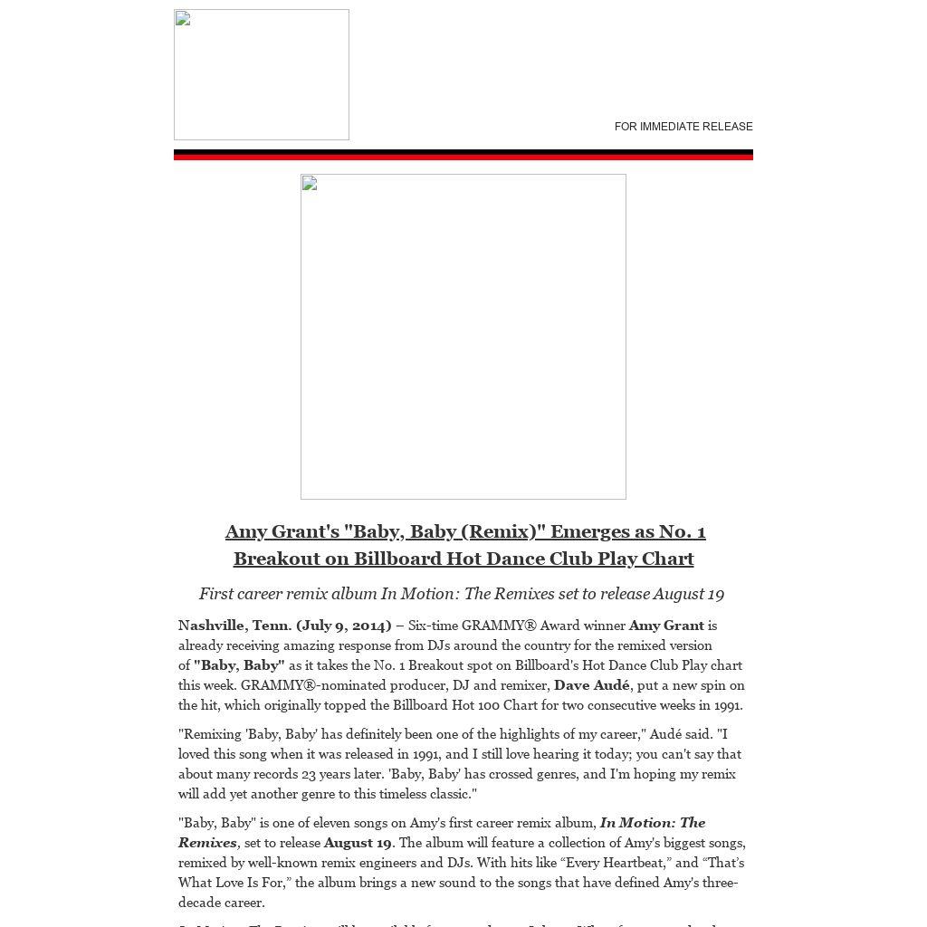 Nashville, Tenn. (July 9, 2014) – Six-time GRAMMY® Award winner Amy Grant is already receiving amazing response from DJs around the country for the remixed version of "Baby, Baby" as it takes the No. 1 Breakout spot on Billboard's Hot Dance Club Play chart this week. GRAMMY®-nominated producer, DJ and remixer, Dave Audé, put a new spin on the hit, which originally topped the Billboard Hot 100 Chart for two consecutive weeks in 1991.