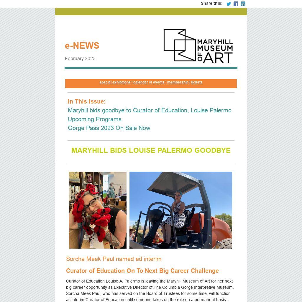 | In This Issue: Maryhill bids goodbye to Curator of Education, Louise Palermo