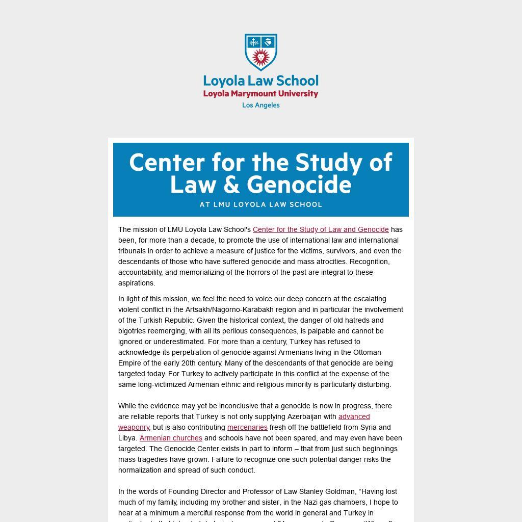 The mission of LMU Loyola Law School's Center for the Study of Law and Genocide has been, for more than a decade, to promote the use of international law and international tribunals in order to achieve a measure of justice for the victims, survivors, and even the descendants of those who have suffered genocide and mass atrocities. Recognition, accountability, and memorializing of the horrors of the past are integral to these aspirations.