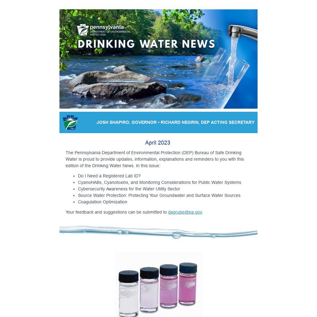 The Pennsylvania Department of Environmental Protection (DEP) Bureau of Safe Drinking Water is proud to provide updates, information, explanations and reminders to you with this edition of the Drinking Water News. In this issue: