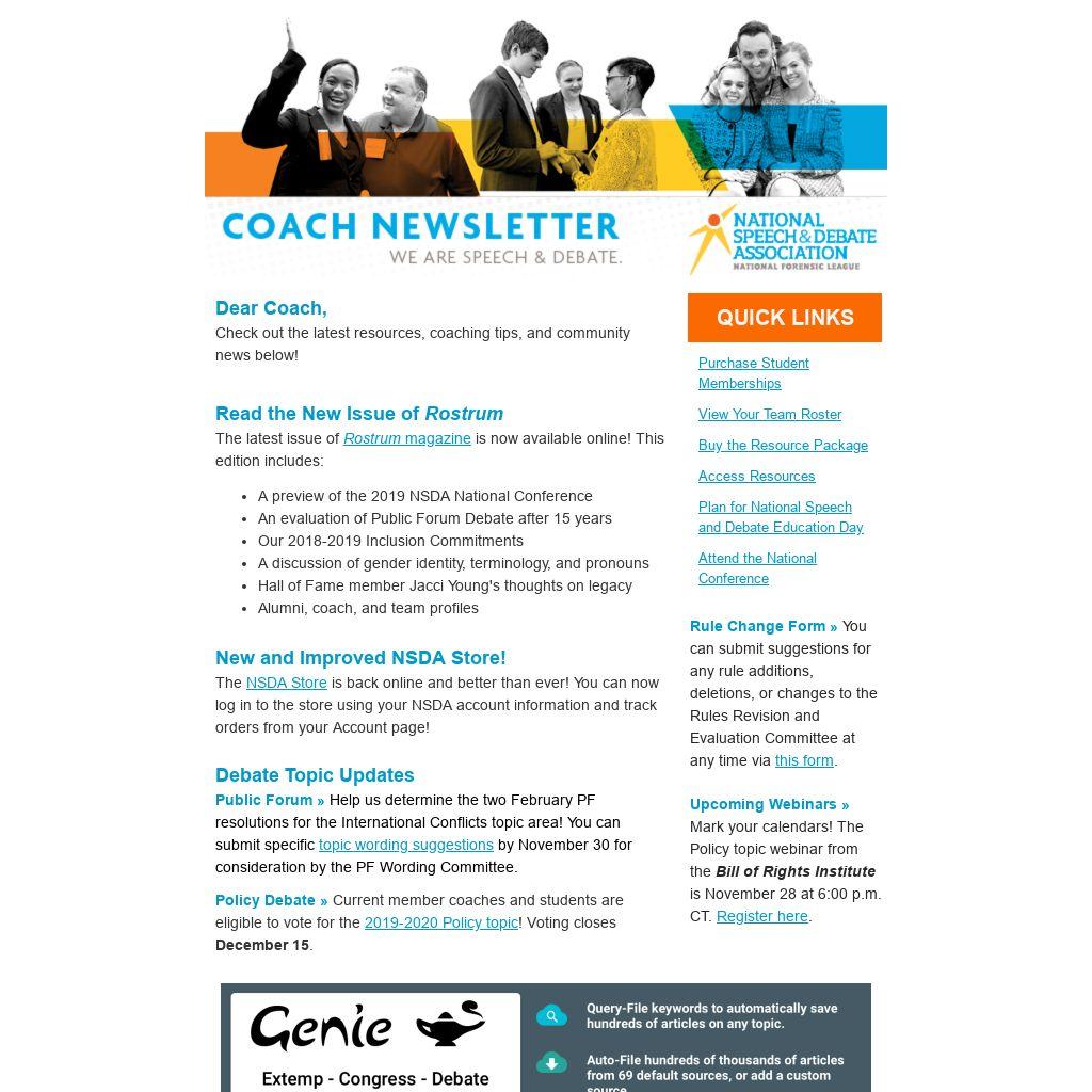 The 2019 NSDA NationalConference is an excellent opportunity for professional development and networking with the top coaches and educators from across the country. Don't delay! If you register before December 31, 2018, you can take advantage of our $100 early bird discount. Learn more»