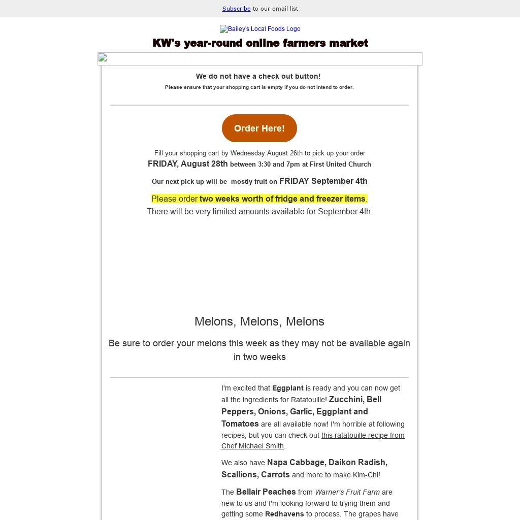| Fill your shopping cart by Wednesday August 26th to pick up your order