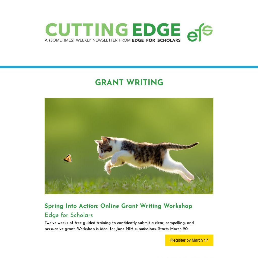Edge for Scholars Twelve weeks of free guided training to confidently submit a clear, compelling, and persuasive grant. Workshop is ideal for June NIH submissions. Starts March 20.