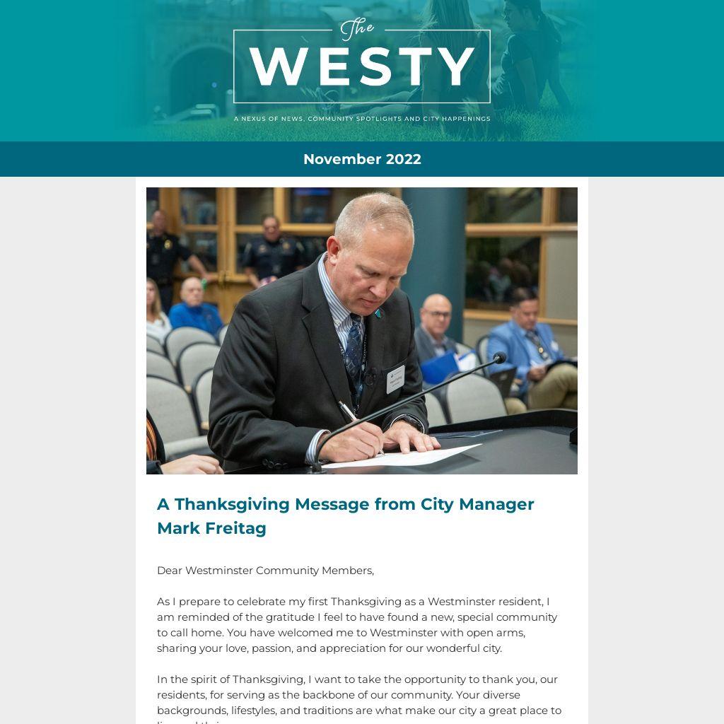 As I prepare to celebrate my first Thanksgiving as a Westminster resident, I am reminded of the gratitude I feel to have found a new, special community to call home. You have welcomed me to Westminster with open arms, sharing your love, passion, and appreciation for our wonderful city.