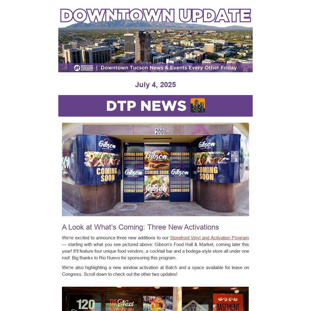 We’re excited to announce three new additions to our Storefront Vinyl and Activation Program — starting with what you see pictured above: Gibson’s Food Hall & Market, coming later this year! It’ll feature four unique food vendors, a cocktail bar and a bodega-style store all under one roof. Big thanks to Rio Nuevo for sponsoring this program.