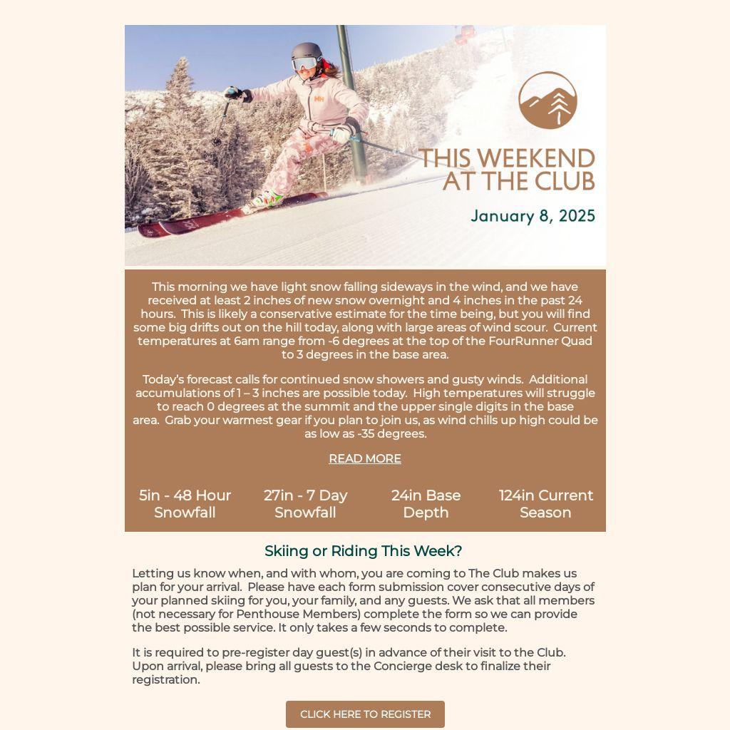 Letting us know when, and with whom, you are coming to The Club makes us plan for your arrival. Please have each form submission cover consecutive days of your planned skiing for you, your family, and any guests. We ask that all members (not necessary for Penthouse Members) complete the form so we can provide the best possible service. It only takes a few seconds to complete.