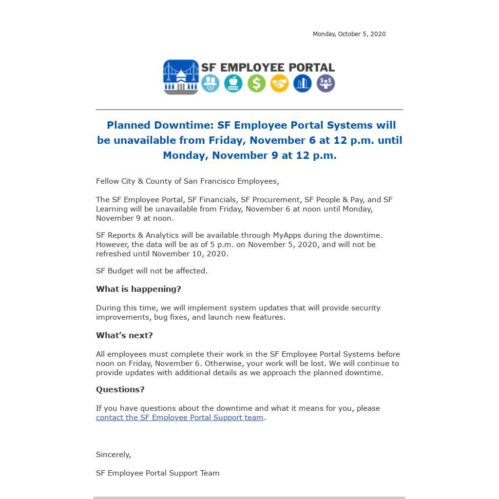 If you have questions about the downtime and what it means for you, please contact the SF Employee Portal Support team.