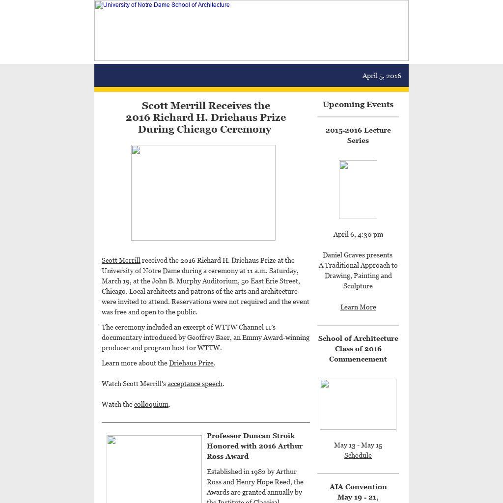 Scott Merrill received the 2016 Richard H. Driehaus Prize at the University of Notre Dame during a ceremony at 11 a.m. Saturday, March 19, at the John B. Murphy Auditorium, 50 East Erie Street, Chicago. Local architects and patrons of the arts and architecture were invited to attend. Reservations were not required and the event was free and open to the public.