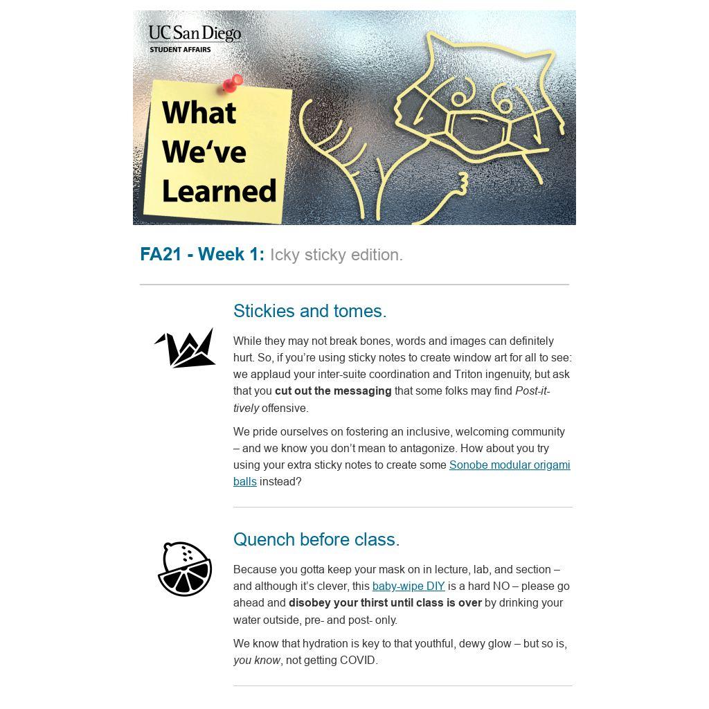 As you reach the end of your first full week at UC San Diego this quarter – and start to get settled into a day-to-day routine – we hope that you’ll appreciate this quick list of ways to ensure you stay healthy and connected to your Triton community: