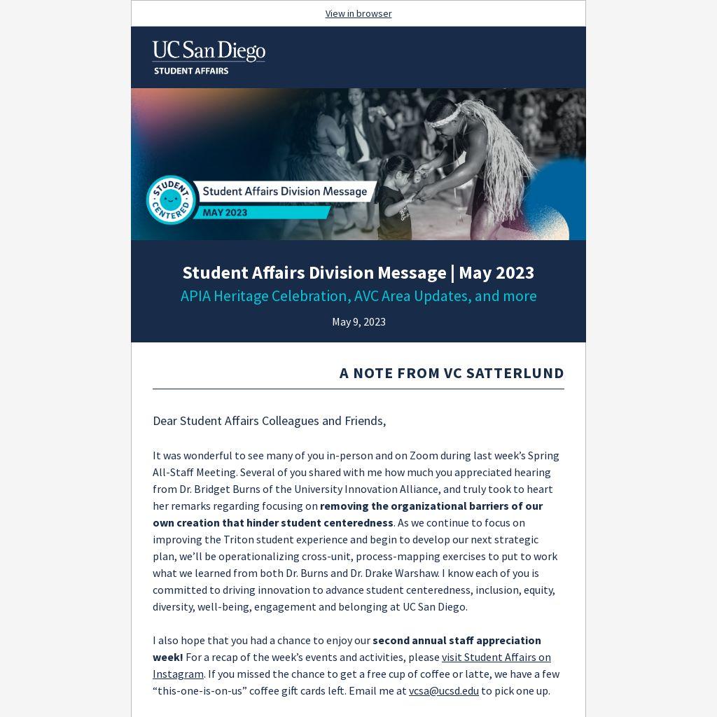 As part of our monthly communications to the division of Student Affairs, we are excited to share quarterly updates and relevant information from our Assistant Vice Chancellors.