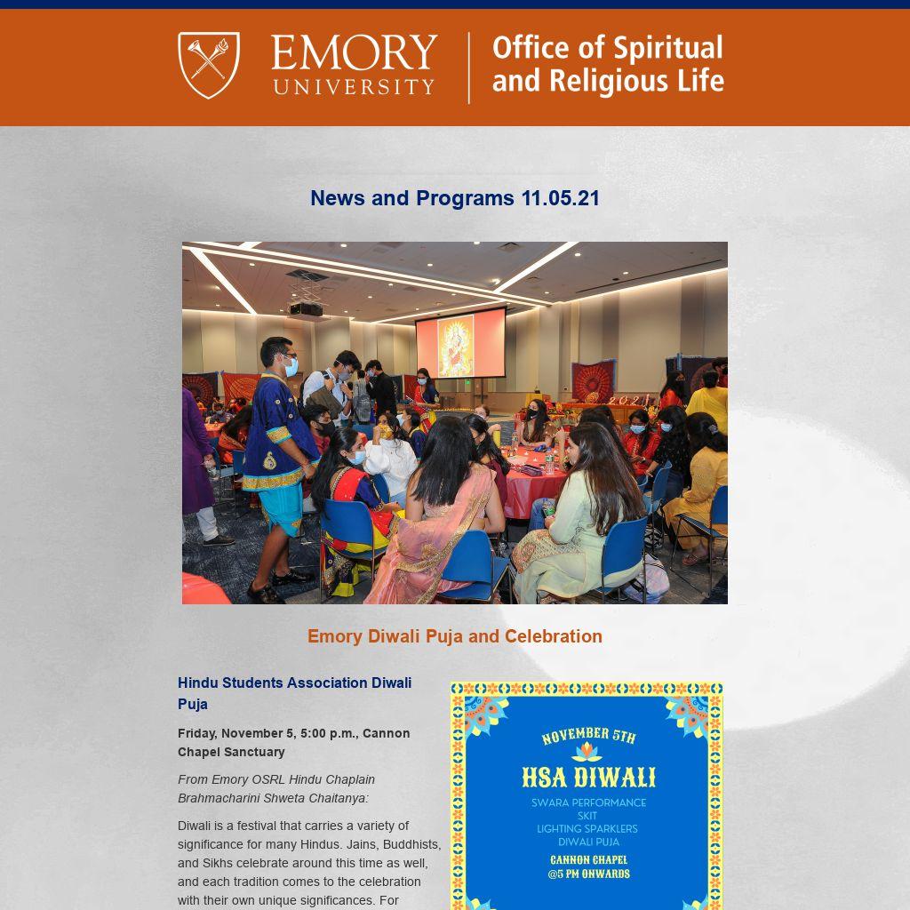 Emory OSRL ENews is published weekly during term by the Emory University Office of Spiritual and Religious Life publicizing Atlanta-campus spiritual life programs. It is not a comprehensive listing. For Oxford College spiritual life, please click here. To submit information or to update your preferences, please contact religiouslife@emory.edu.