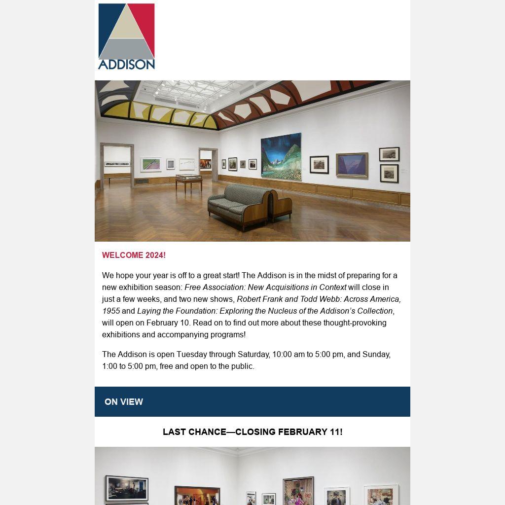 The Addison is open Tuesday through Saturday, 10:00 am to 5:00 pm, and Sunday, 1:00 to 5:00 pm, free and open to the public.