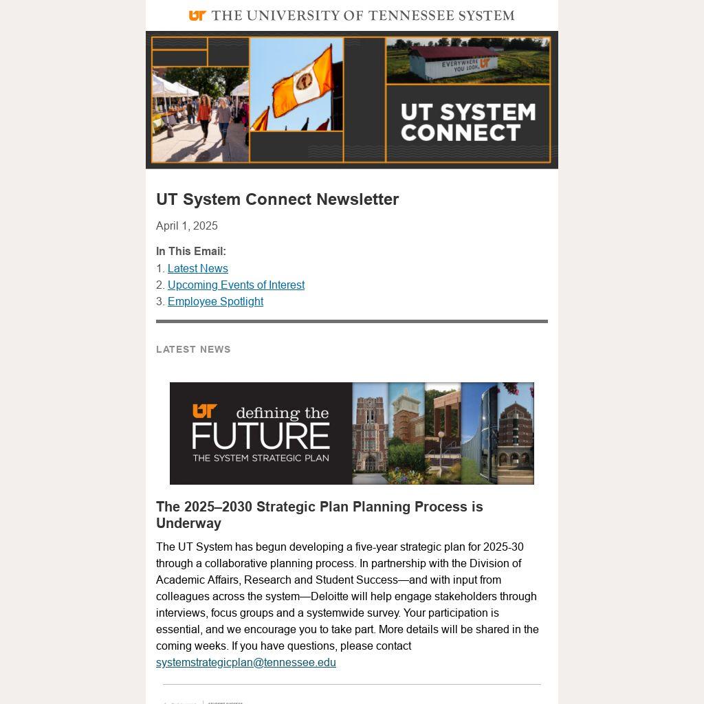 The UT System has begun developing a five-year strategic plan for 2025-30 through a collaborative planning process. In partnership with the Division of Academic Affairs, Research and Student Success—and with input from colleagues across the system—Deloitte will help engage stakeholders through interviews, focus groups and a systemwide survey. Your participation is essential, and we encourage you to take part. More details will be shared in the coming weeks. If you have questions, please contact systemstrategicplan@tennessee.edu