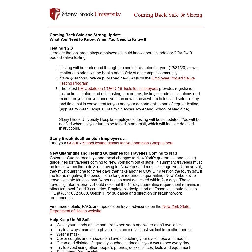 Governor Cuomo recently announced changes to New York’s quarantine and testing guidelines for travelers coming to New York from out of state. In summary, travelers must be tested within three days of leaving for New York and must test negative. Upon arrival, they must quarantine for three days then take another COVID-19 test on the fourth day. If the test is negative, the person is no longer required to quarantine. New Yorkers who leave the state for less than 24 hours also must get tested within four days. Those travelling internationally should note that the 14-day quarantine requirement remains in effect for Level 2 and 3 countries. Employees designated as Essential should call the HIL at (631) 632-5000, Option 1, for guidance and direction on return to work requirements.