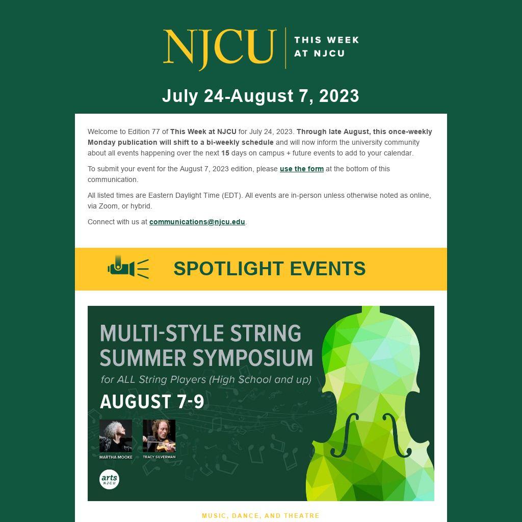 Welcome to Edition 77 of This Week at NJCU for July 24, 2023. Through late August, this once-weekly Monday publication will shift to a bi-weekly schedule and will now inform the university community about all events happening over the next 15 days on campus + future events to add to your calendar.