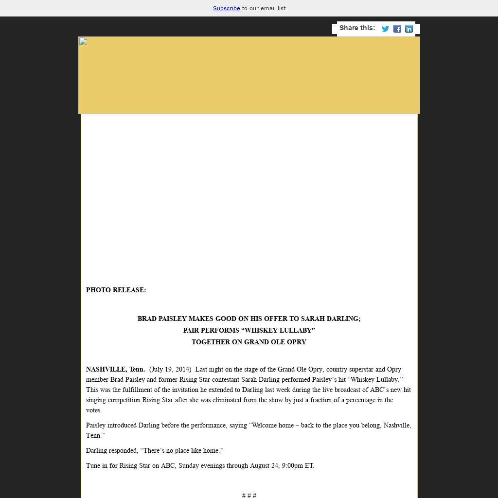 NASHVILLE, Tenn. (July 19, 2014) Last night on the stage of the Grand Ole Opry, country superstar and Opry member Brad Paisley and former Rising Star contestant Sarah Darling performed Paisley’s hit “Whiskey Lullaby.” This was the fulfillment of the invitation he extended to Darling last week during the live broadcast of ABC’s new hit singing competition Rising Star after she was eliminated from the show by just a fraction of a percentage in the votes.