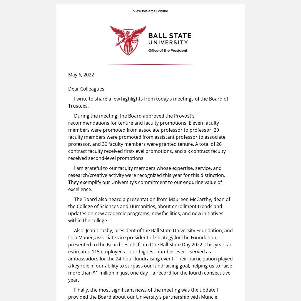 Also, Jean Crosby, president of the Ball State University Foundation, and Lola Mauer, associate vice president of strategy for the Foundation, presented to the Board results from One Ball State Day 2022. This year, an estimated 115 employees—our highest number ever—served as ambassadors for the 24-hour fundraising event. Their participation played a key role in our ability to surpass our fundraising goal, helping us to raise more than $1 million in just one day—a record for the fourth consecutive year.